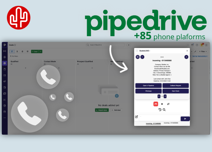 Fantastisch nieuws voor alle Pipedrive gebruikers! Ontdek de nieuwste generatie integraties waarmee je al je klantinteracties rechtstreeks vanuit je vertrouwde CRM-systeem beheert. Onze gloednieuwe embedded integratie voor Pipedrive is nu beschikbaar en werkt naadloos samen met meer dan 85 verschillende telefonieplatformen. Beleef de kracht van integratietool Bubble — nu volledig geïntegreerd in Pipedrive.